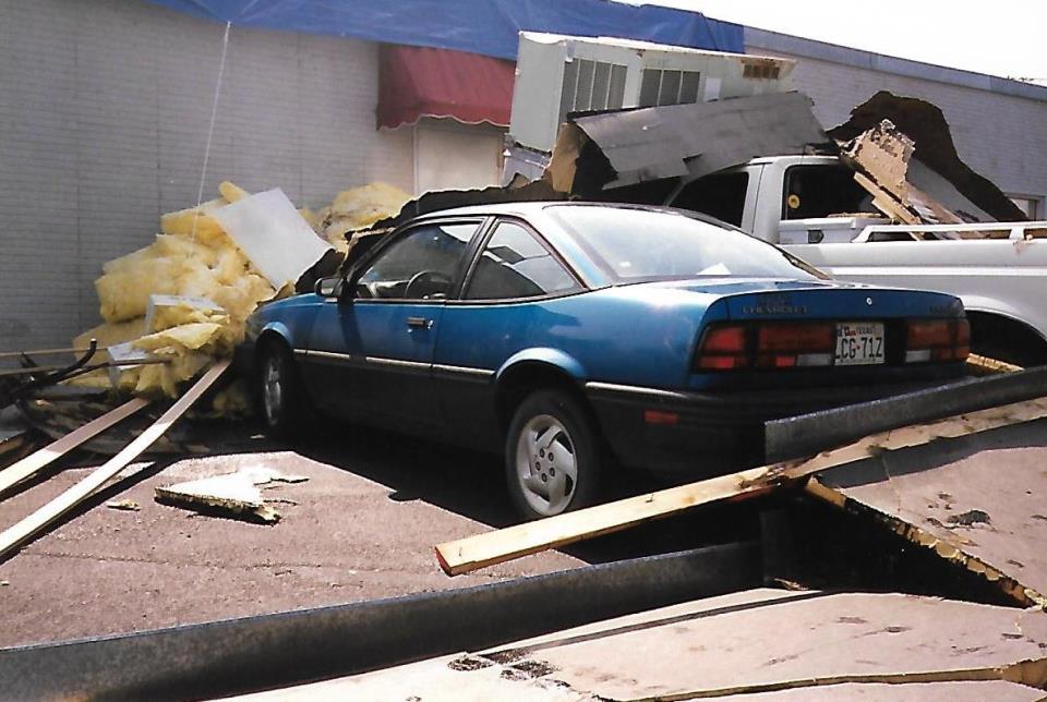 Strong thunderstorms were passing through the Metroplex that day. People from across the street from our studios describe seeing the roof peeling off and falling into the parking lot behind out building.